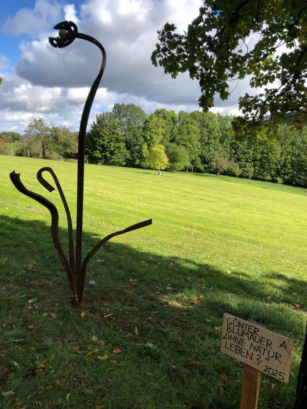 Charlotte Seidl hat einen eindrucksvollen, in Blautönen leuchtenden "Flügel der Erinnerung" geschaffen, der eines der großen künstlerischen Themen ihres vor wenigen Jahren verstorbenen Lebens- und Arbeitspartners, Johannes Seidl, aufnimmt: Den Flügel, in der natürlichen Form gekrümmt, bearbeitete Johannes in vielen Variationen in Edelstahl und montierte seine Werke frei drehend – mit dem sanftesten Windhauch sich in Bewegung setzend.